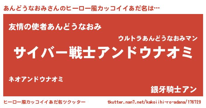 | 男性向けラノベタイトル風あだ名 | 『Re:あんどうなおみから始める異世界生活』 |