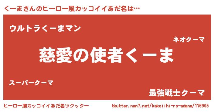 | 男性向けラノベタイトル風あだ名 | 『くーまに滅ぼされるだけの簡単なお仕事です』 |