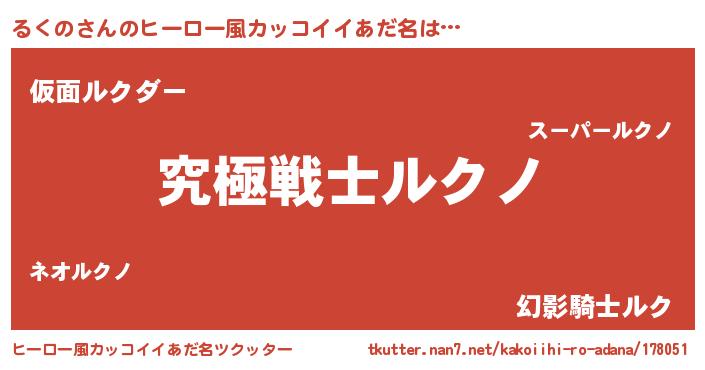 | 男性向けラノベタイトル風あだ名 | 『Re:るくのから始める異世界生活』 |
