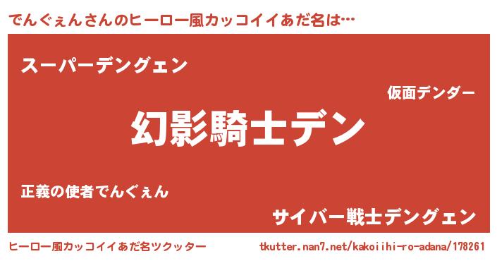 | 男性向けラノベタイトル風あだ名 | 『でんぐぇんの嫁は女の子じゃないと思った?』 |