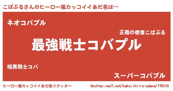 | 男性向けラノベタイトル風あだ名 | 『Re:こばぷるから始める異世界生活』 |