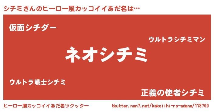 | 男性向けラノベタイトル風あだ名 | 『シチミという概念が存在しない退屈な世界 』 |