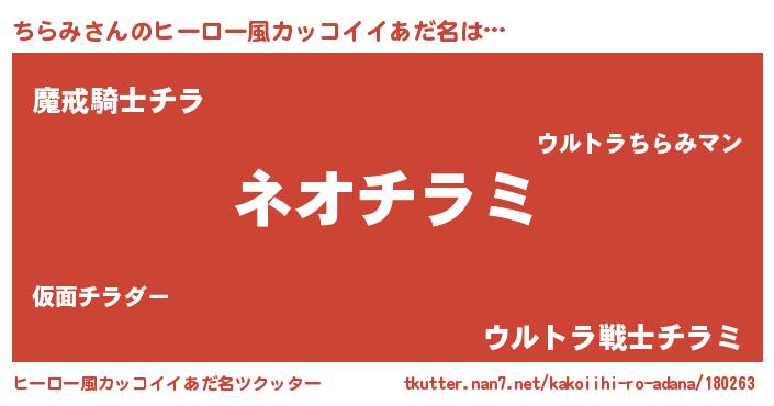 | 男性向けラノベタイトル風あだ名 | 『ちらみという概念が存在しない退屈な世界 』 |