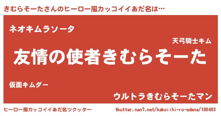 | 男性向けラノベタイトル風あだ名 | 『おまえをオタクにしてやるから、俺をきむらそーたにしてくれ! 』 |
