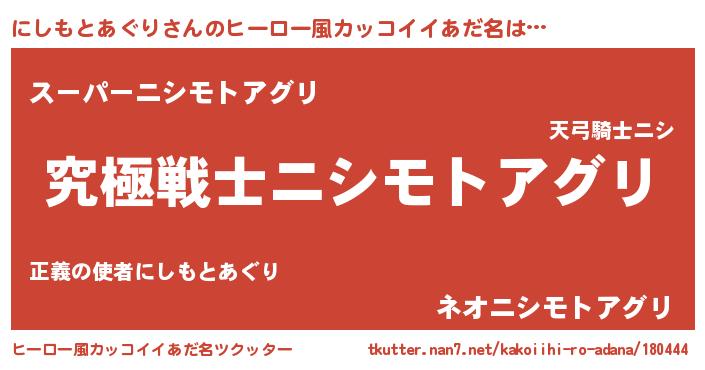 | 男性向けラノベタイトル風あだ名 | 『にしもとあぐり~年齢イコール彼女いない歴の魔法使い~』 |