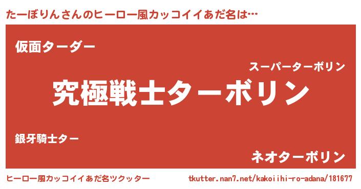 | 男性向けラノベタイトル風あだ名 | 『Re:たーぼりんから始める異世界生活』 |