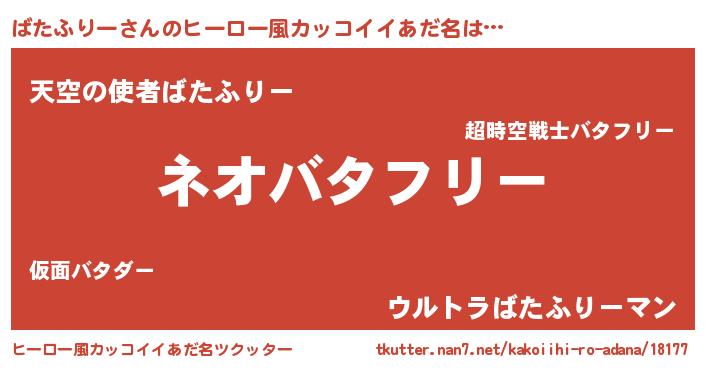 | 男性向けラノベタイトル風あだ名 | 『ばたふりーという概念が存在しない退屈な世界 』 |