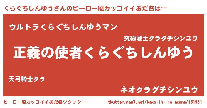 | 男性向けラノベタイトル風あだ名 | 『クラグチシンユウスレイヤー』 |