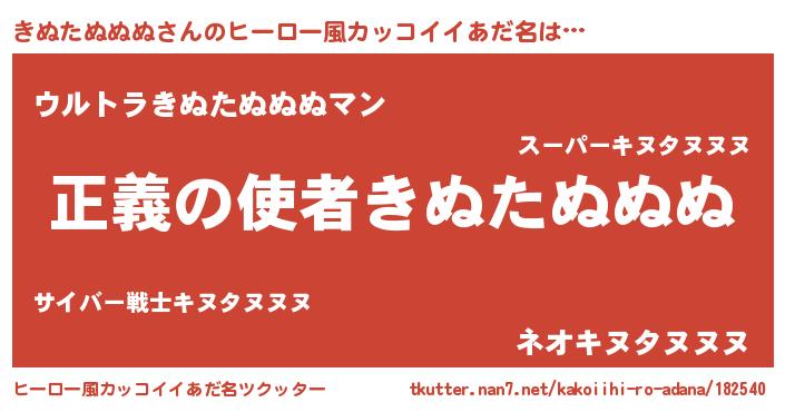 | 女子向けラノベタイトル風あだ名 | 『きぬたぬぬぬ夫妻のなれそめ』 |
