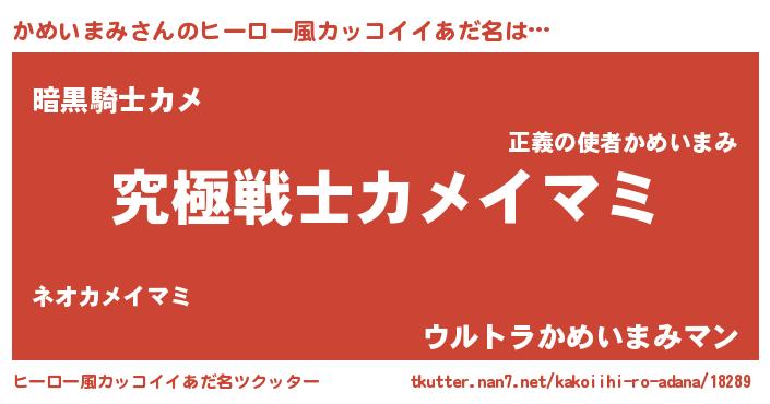 | 男性向けラノベタイトル風あだ名 | 『かめいまみ~年齢イコール彼女いない歴の魔法使い~』 |