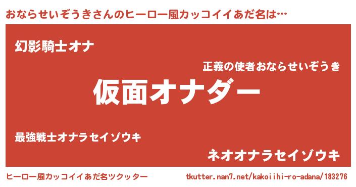 | 男性向けラノベタイトル風あだ名 | 『この素晴らしい世界におならせいぞうきを!』 |
