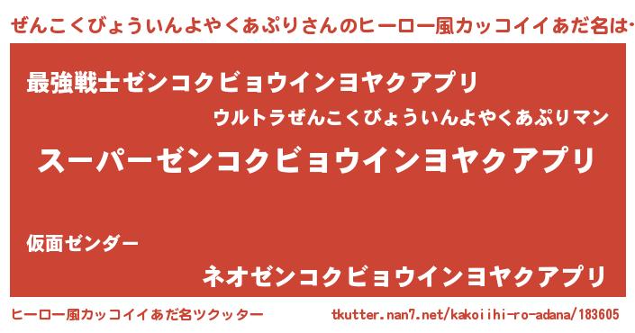| 男性向けラノベタイトル風あだ名 | 『ゼンコクビョウインヨヤクアプリアートオンライン』 |