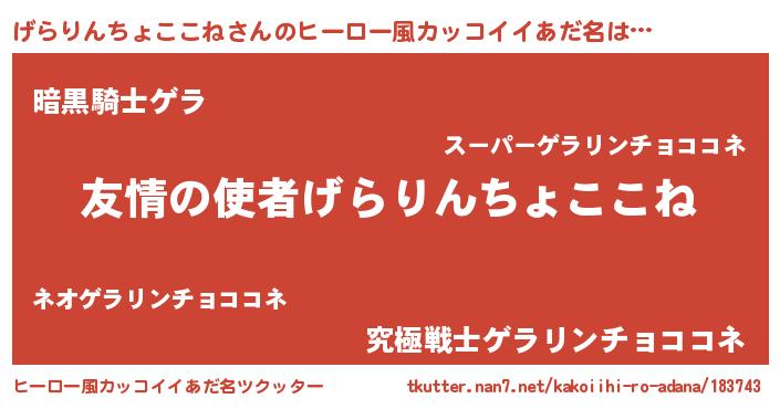 | 男性向けラノベタイトル風あだ名 | 『おまえをオタクにしてやるから、俺をげらりんちょここねにしてくれ! 』 |