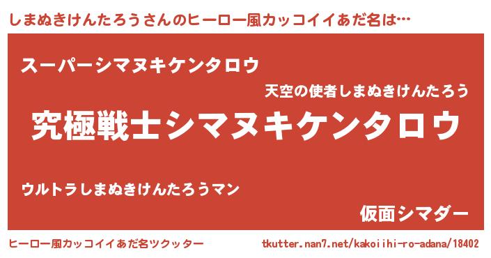 | 男性向けラノベタイトル風あだ名 | 『Re:しまぬきけんたろうから始める異世界生活』 |