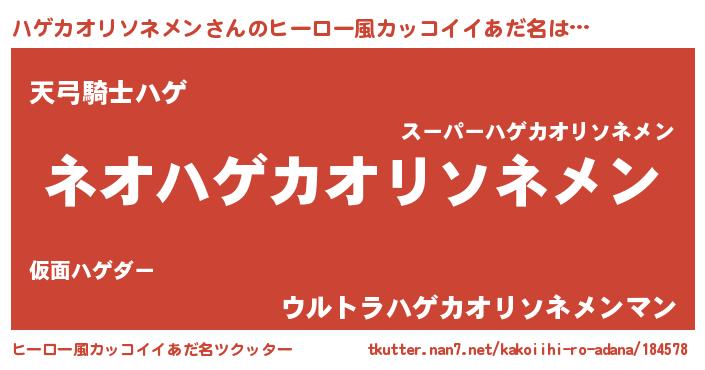 | 男性向けラノベタイトル風あだ名 | 『ハゲカオリソネメンという概念が存在しない退屈な世界 』 |