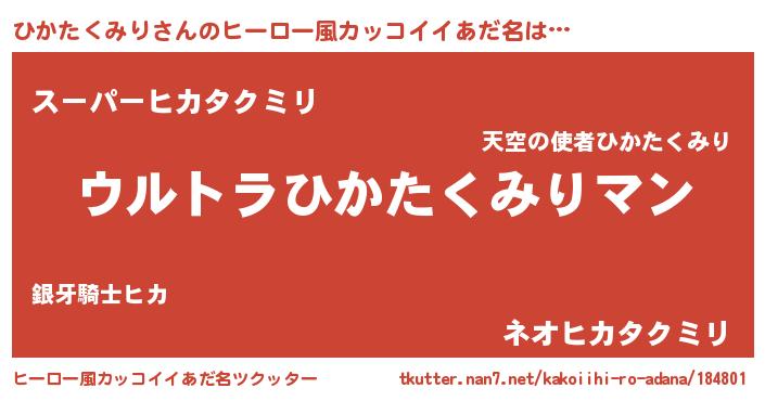 | 男性向けラノベタイトル風あだ名 | 『ひかたくみり~年齢イコール彼女いない歴の魔法使い~』 |