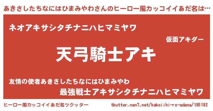 | 男性向けラノベタイトル風あだ名 | 『あきさしたちなにはひまみやわに滅ぼされるだけの簡単なお仕事です』 |