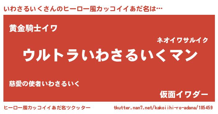 | 男性向けラノベタイトル風あだ名 | 『いわさるいく~年齢イコール彼女いない歴の魔法使い~』 |