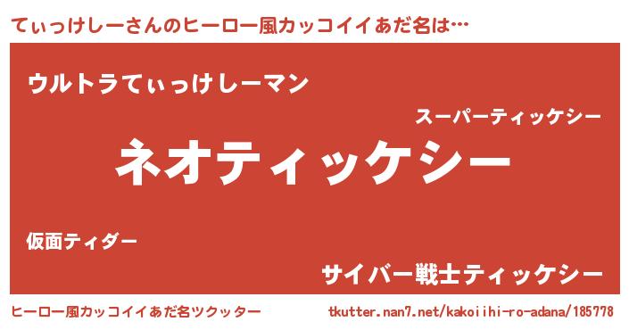 | 男性向けラノベタイトル風あだ名 | 『てぃっけしーという概念が存在しない退屈な世界 』 |