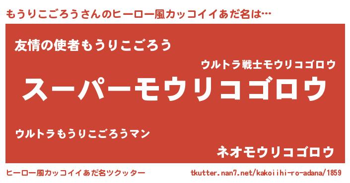 | 男性向けラノベタイトル風あだ名 | 『もうりこごろう~年齢イコール彼女いない歴の魔法使い~』 |