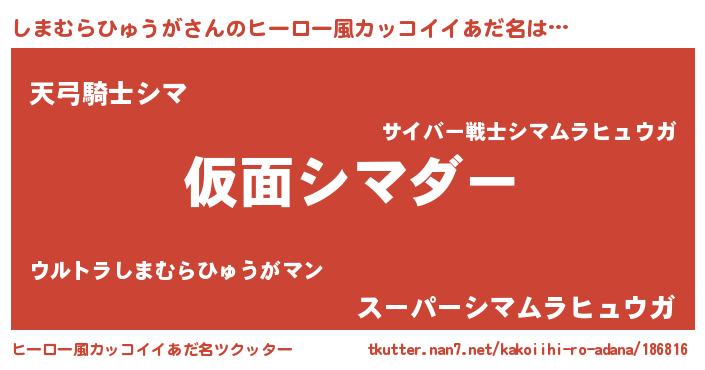 | 女子向けラノベタイトル風あだ名 | 『しまむらひゅうがが死なない童話 林檎のしまむらひゅうがの診療簿』 |