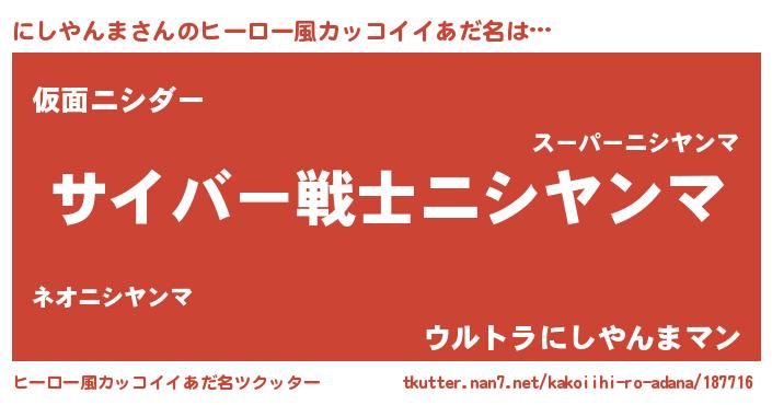 | 男性向けラノベタイトル風あだ名 | 『Re:にしやんまから始める異世界生活』 |