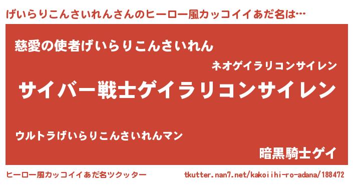 | 意味不明あだ名 | 『自称げいらりこんさいれん』 |