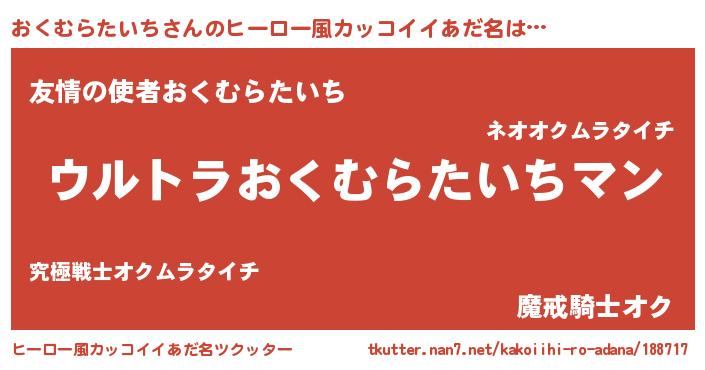 | 男性向けラノベタイトル風あだ名 | 『おくむらたいち~年齢イコール彼女いない歴の魔法使い~』 |