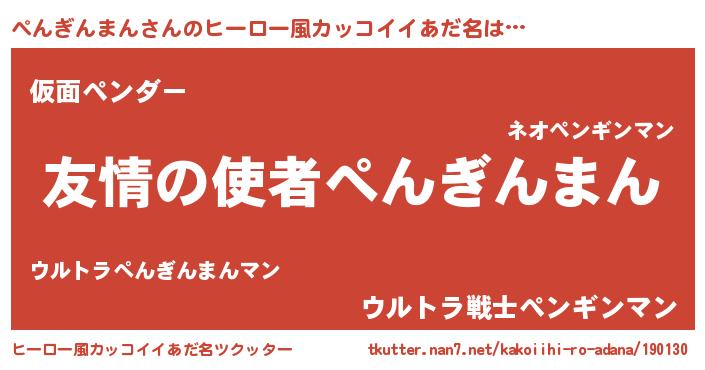 | 女子向けラノベタイトル風あだ名 | 『ぺんぎんまん夫妻のなれそめ』 |