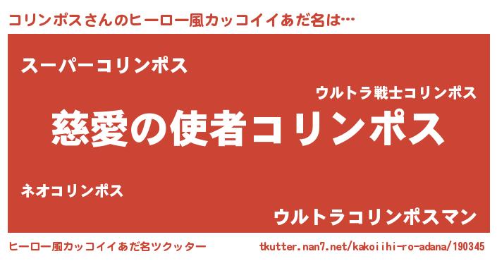 | 男性向けラノベタイトル風あだ名 | 『コリンポスに滅ぼされるだけの簡単なお仕事です』 |