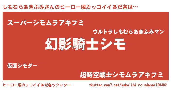 | 男性向けラノベタイトル風あだ名 | 『しもむらあきふみの嫁は女の子じゃないと思った?』 |