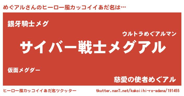 | 男性向けラノベタイトル風あだ名 | 『Re:めぐアルから始める異世界生活』 |