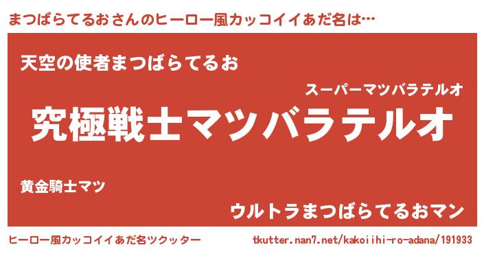 | 男性向けラノベタイトル風あだ名 | 『まつばらてるお~年齢イコール彼女いない歴の魔法使い~』 |