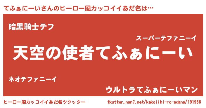 | 女子向けラノベタイトル風あだ名 | 『てふぁにーいの玉の輿計画!』 |