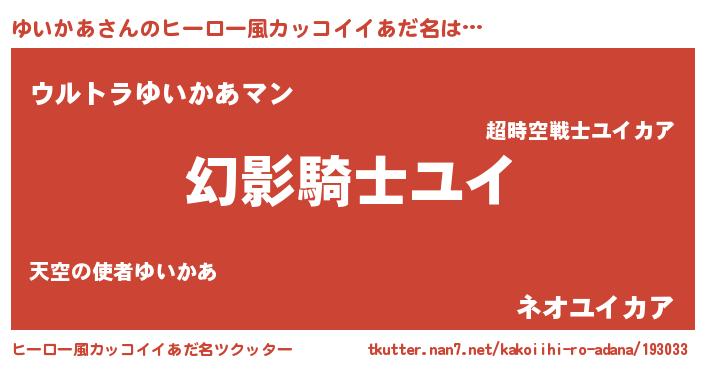 | 男性向けラノベタイトル風あだ名 | 『ゆいかあの嫁は女の子じゃないと思った?』 |