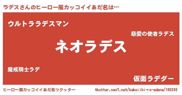 | 男性向けラノベタイトル風あだ名 | 『ラデス~年齢イコール彼女いない歴の魔法使い~』 |
