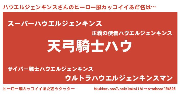 | 男性向けラノベタイトル風あだ名 | 『ハウエルジェンキンスの嫁は女の子じゃないと思った?』 |