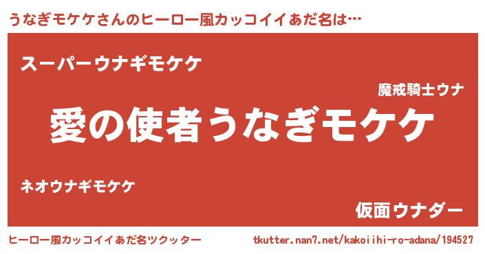 | 男性向けラノベタイトル風あだ名 | 『うなぎモケケに滅ぼされるだけの簡単なお仕事です』 |