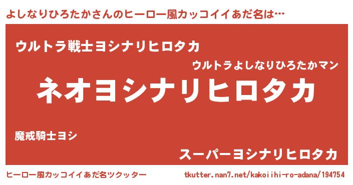 | 男性向けラノベタイトル風あだ名 | 『うちのよしなりひろたかが世界を掌握している!』 |