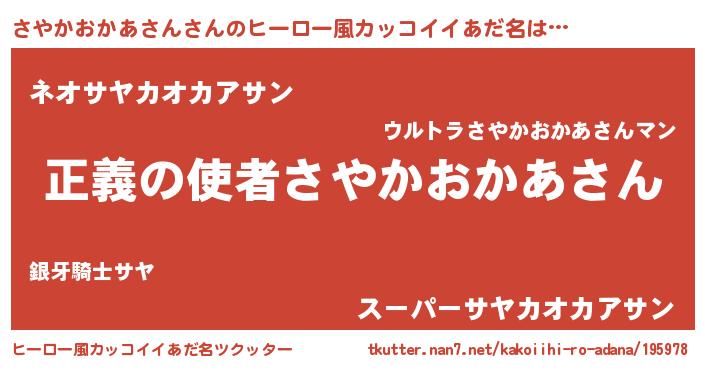 | 男性向けラノベタイトル風あだ名 | 『サヤカオカアサンスレイヤー』 |