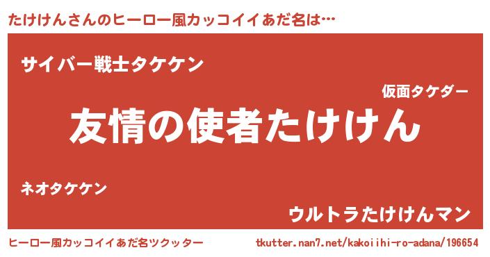 | 男性向けラノベタイトル風あだ名 | 『おまえをオタクにしてやるから、俺をたけけんにしてくれ! 』 |