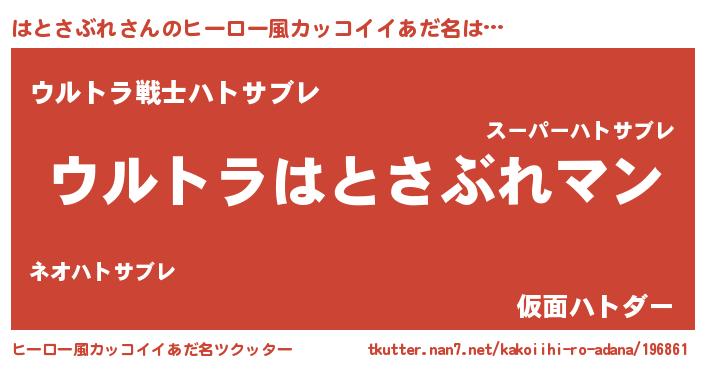 | 男性向けラノベタイトル風あだ名 | 『はとさぶれ~年齢イコール彼女いない歴の魔法使い~』 |