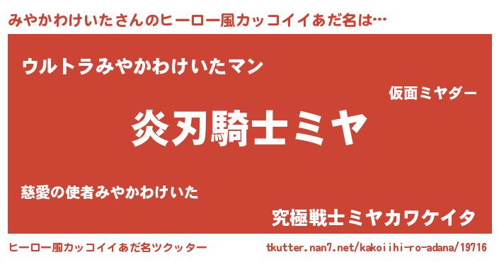 | 男性向けラノベタイトル風あだ名 | 『みやかわけいたの嫁は女の子じゃないと思った?』 |