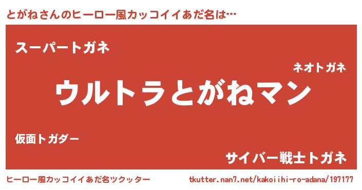 | 男性向けラノベタイトル風あだ名 | 『とがねに滅ぼされるだけの簡単なお仕事です』 |