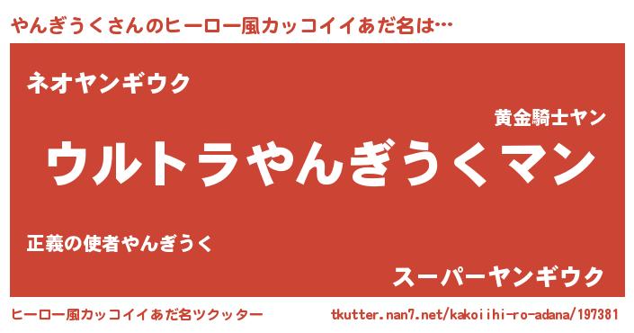 | 男性向けラノベタイトル風あだ名 | 『うちのやんぎうくが世界を掌握している!』 |