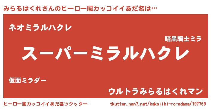 | 男性向けラノベタイトル風あだ名 | 『みらるはくれに滅ぼされるだけの簡単なお仕事です』 |