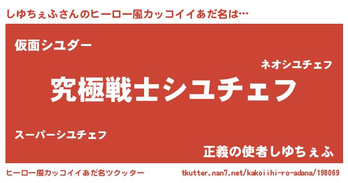 | 男性向けラノベタイトル風あだ名 | 『Re:しゆちぇふから始める異世界生活』 |