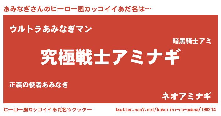 | 男性向けラノベタイトル風あだ名 | 『Re:あみなぎから始める異世界生活』 |