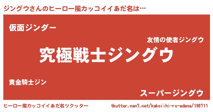 | 男性向けラノベタイトル風あだ名 | 『Re:ジングウから始める異世界生活』 |