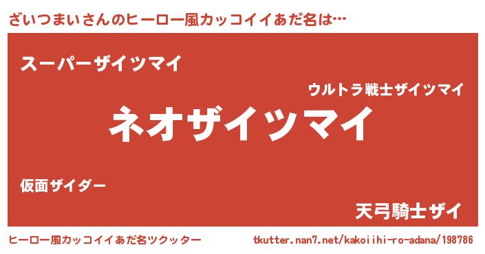 | 男性向けラノベタイトル風あだ名 | 『ざいつまいという概念が存在しない退屈な世界 』 |